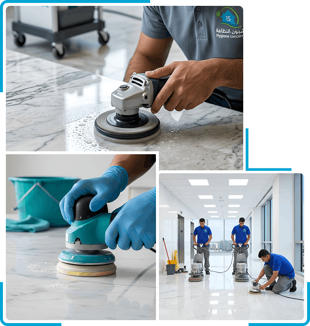 خدمة جلي وتلميع الرخام باستخدام معدات متخصصة لإزالة الخـدوش والبقـع وإعادة اللمعـان الطبيعـي للأرضيــات مع الحفاظ على جودة الرخام.